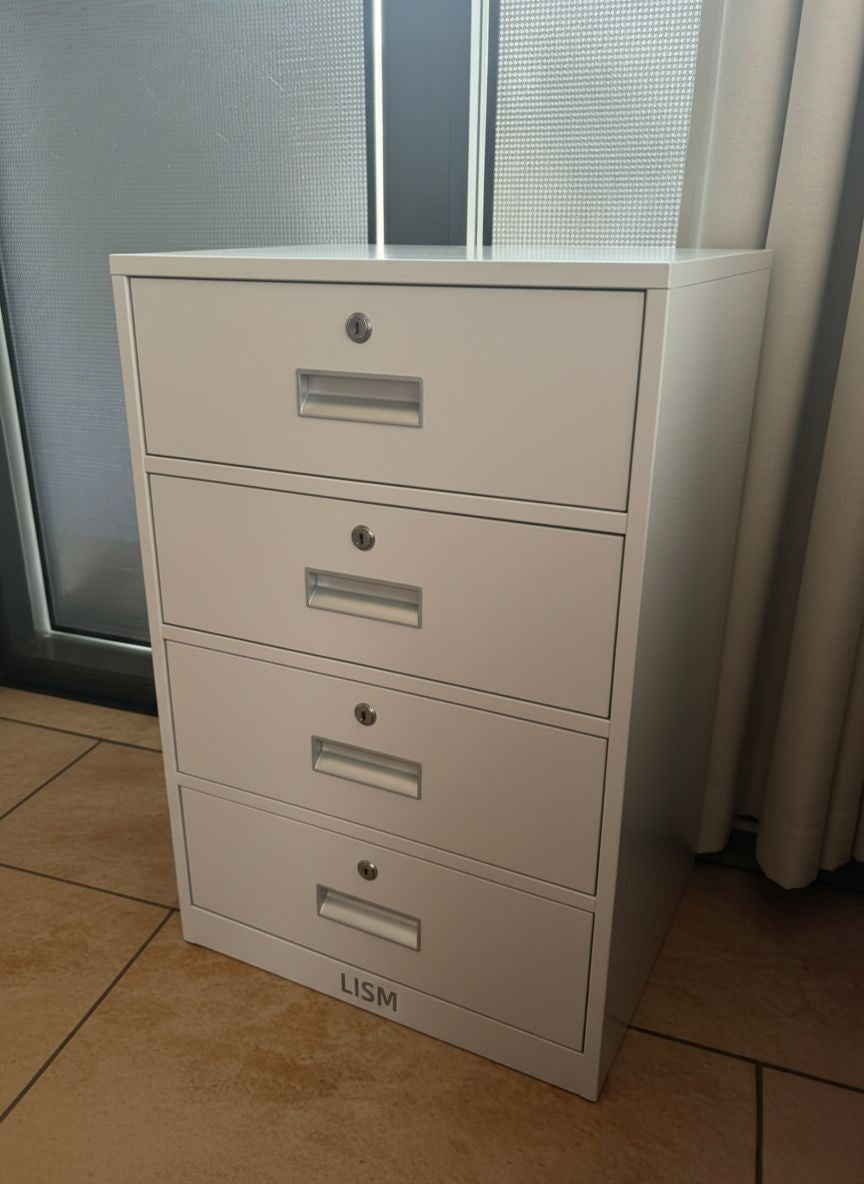 - This is a four story metal cabinet with locks, presenting a clean light gray color scheme. It is made of matte metal sheets with simple and neat appearance lines, giving it a practical feel unique to office furniture.
