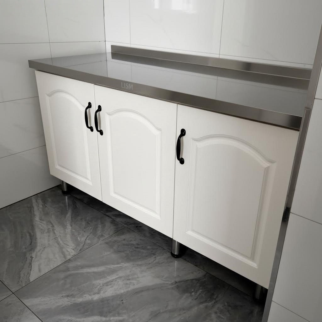 - The cabinet body adopts a white shaped cabinet door, decorated with soft curved lines, and paired with black long handle handles, with a fresh and tidy style; The countertop is made of glossy stainless steel material, with a smooth and easy to clean surface. The front edge of the countertop also has a slight water blocking design, which can reduce the overflow of water stains during kitchen operations. The bottom of the cabinet is equipped with metal support feet, which not only increases the height of the cabinet above the ground, facilitates daily cleaning of the ground, but also enhances the stability of the cabinet.