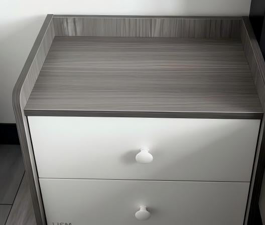 - The cabinet adopts a contrasting design of imitation wood grain board and matte white drawer panel. The wood grain texture is delicate and natural, and the white panel is clean and soft. Paired with rounded edges, it not only avoids the risk of sharp edge collision, but also makes the overall visual more warm; The surface is coated with wear-resistant and scratch resistant film technology, which is not easy to leave marks on daily wiping and minor scratches, and has excellent durability.
